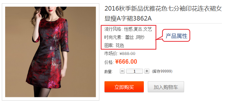 不同类商品的产品属性不尽相同,如食品会有保质期、产地、原材料;电脑会有主频、内在大小、显卡等内容,这些均可用产品属性来表现。