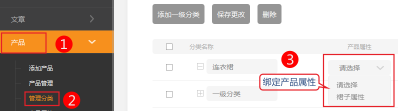 2、依次点击 产品-》产品分类-》为分类绑定需要的产品属性
