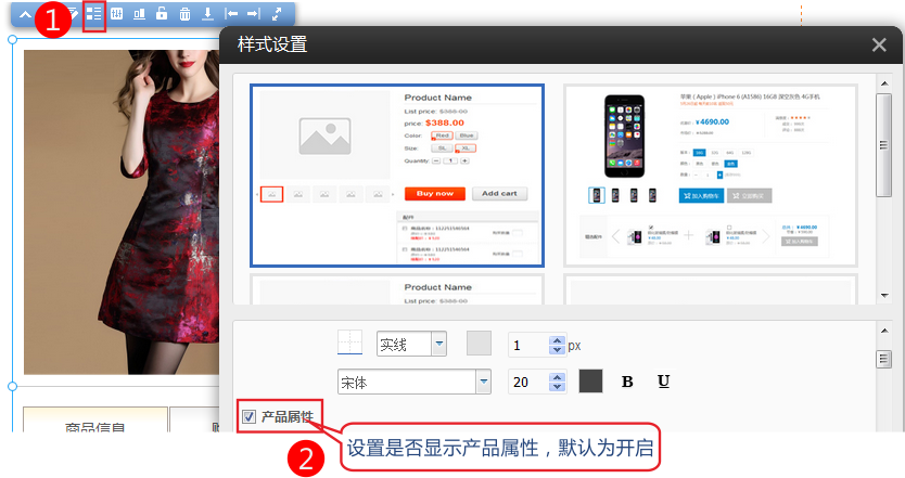 在产品详情插件中可以设置是否显示产品属性